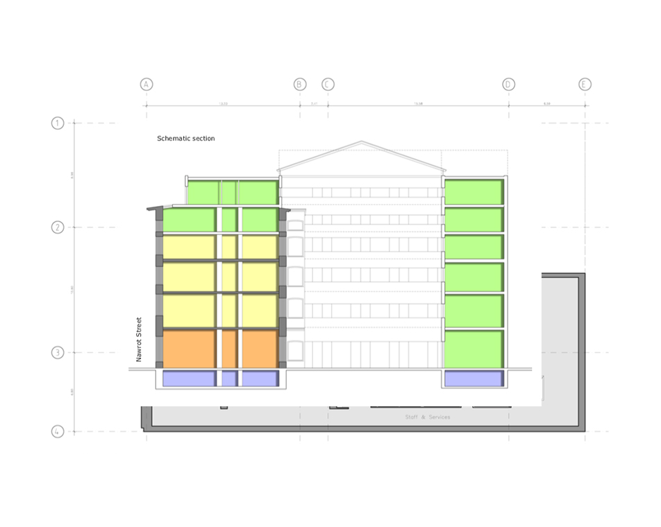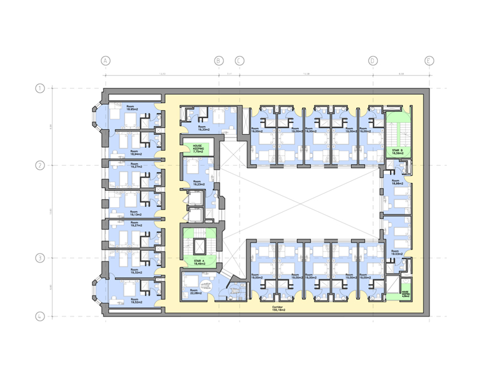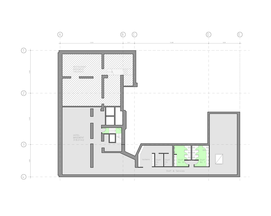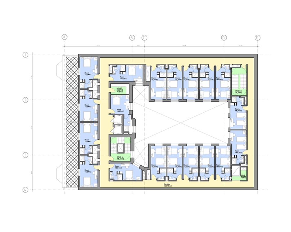 La progettazione prevede il mantenimento dell’edificio soggetto a vincolo storico con la demolizione e ricostruzione ex novo delle volumetrie necessarie al fine di poter disporre di 100 camere.