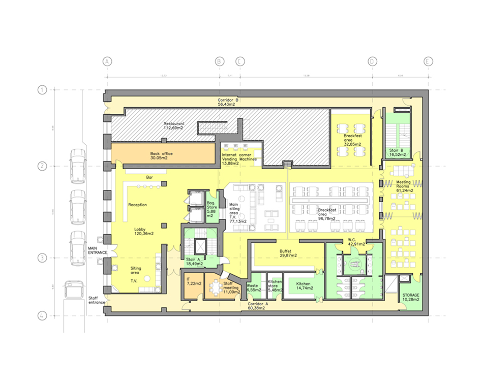 L’hotel nel suo insieme sarà dotato delle parti comuni destinate ai servizi e con patio interno.